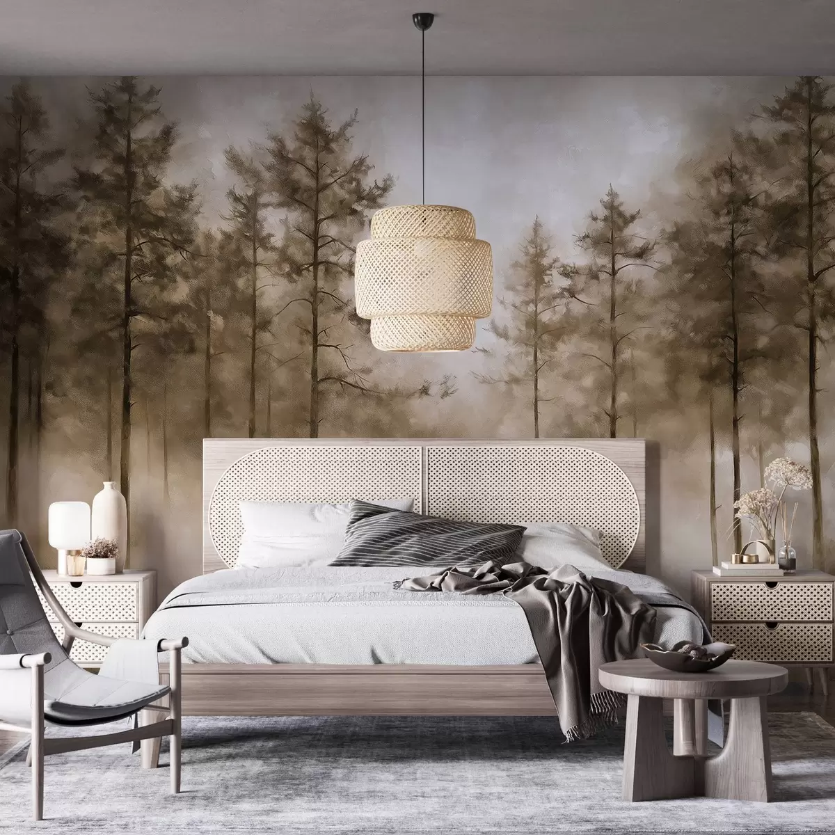 Carta da parati Foresta mistica, pini, nebbia, pittura acrilica, colori beige nr. w02149v1