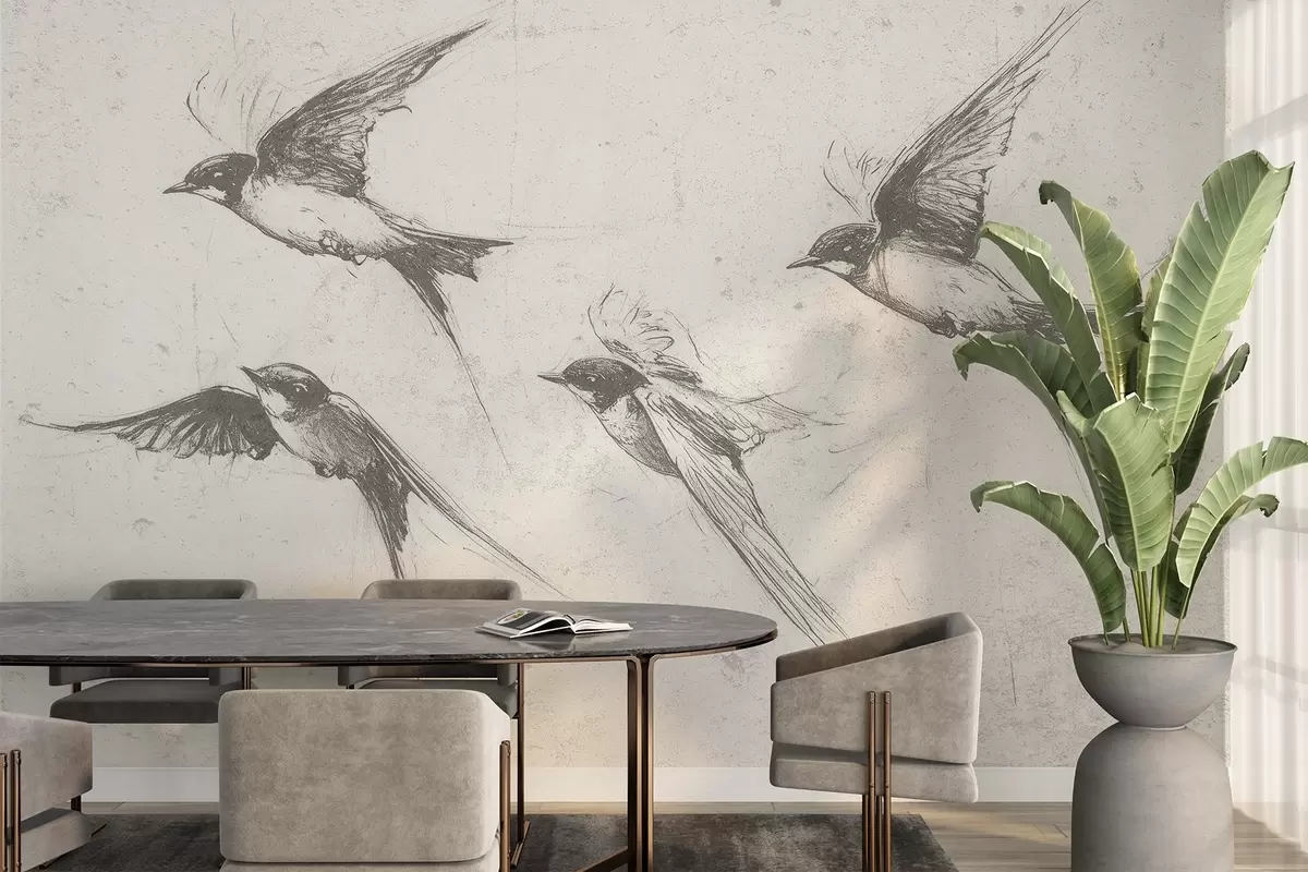 Carta da parati Uccelli volanti, disegno a inchiostro, minimalismo, colori grigi nr. w02155