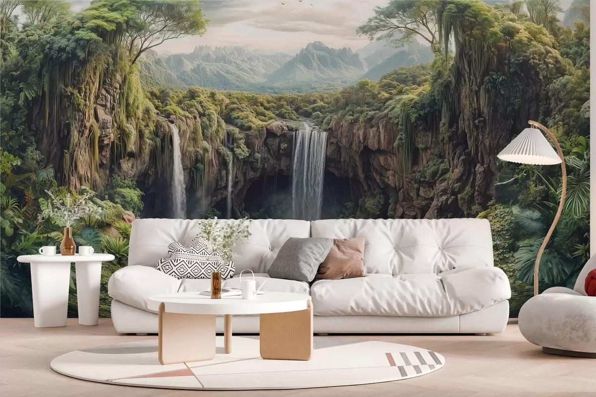 Carta da parati grande panorama del canyon con alberi e una cascata nr. w02294