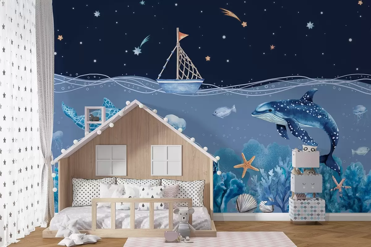 Carta da parati Vita di mare, stile acquerello, coralli, barca, delfino, medusa, cielo notturno stellato, colori blu nr. w02310