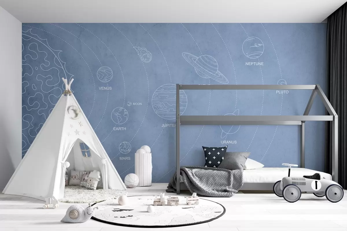 Carta da parati Sistema solare in stile minimalista su sfondo blu strutturato nr. w02344v1