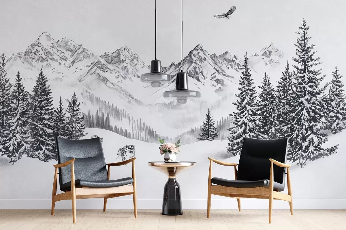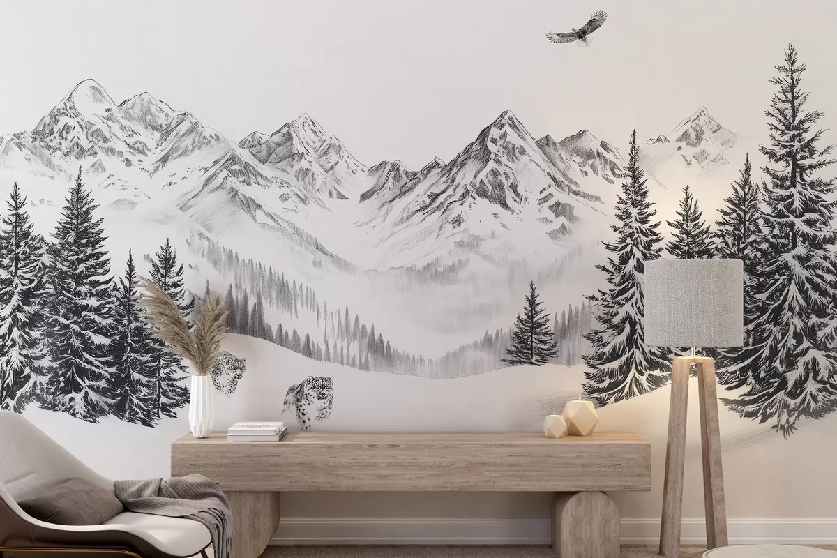Carta da parati Montagne invernali, leopardi delle nevi, pineta, disegno a matita, aquila in volo nr. w02360