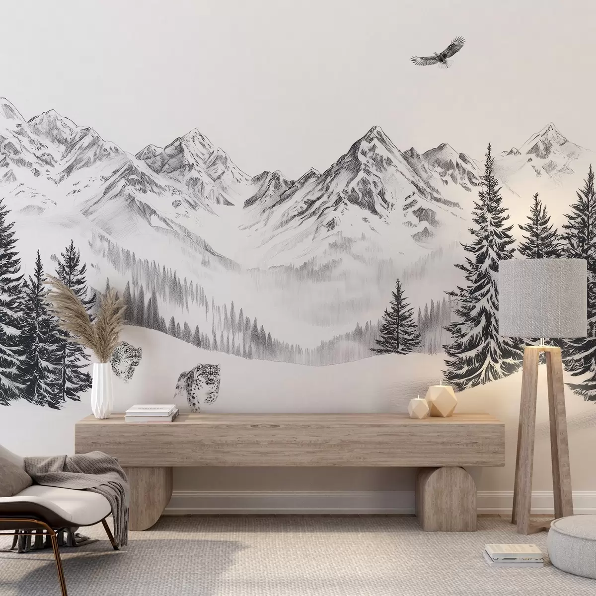 Carta da parati Montagne invernali, leopardi delle nevi, pineta, disegno a matita, aquila in volo nr. w02360