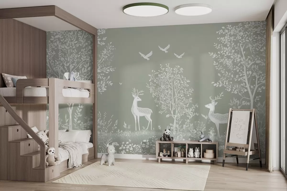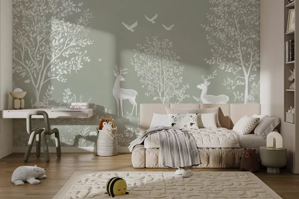 Carta da parati foresta con cervi nello stile di un disegno a gesso su sfondo olivastro nr. w02444v1