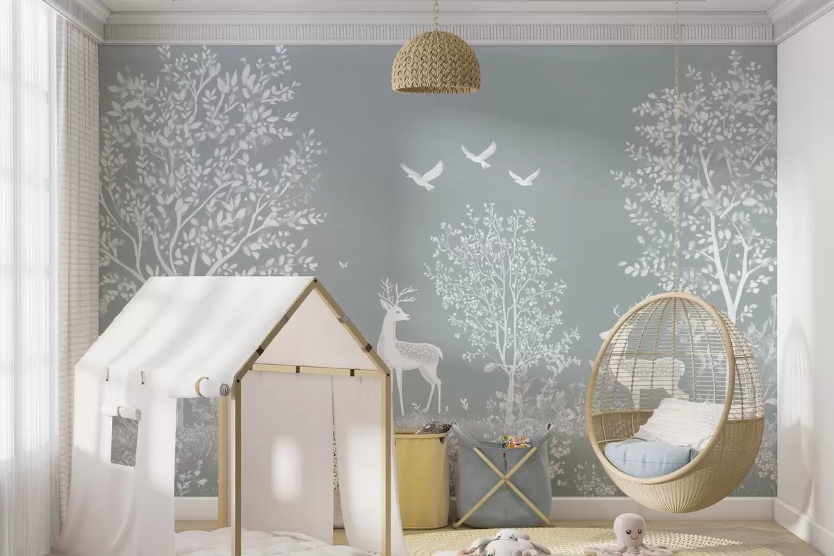 Carta da parati foresta con cervi nello stile di un disegno a gesso su sfondo grigio nr. w02444v2