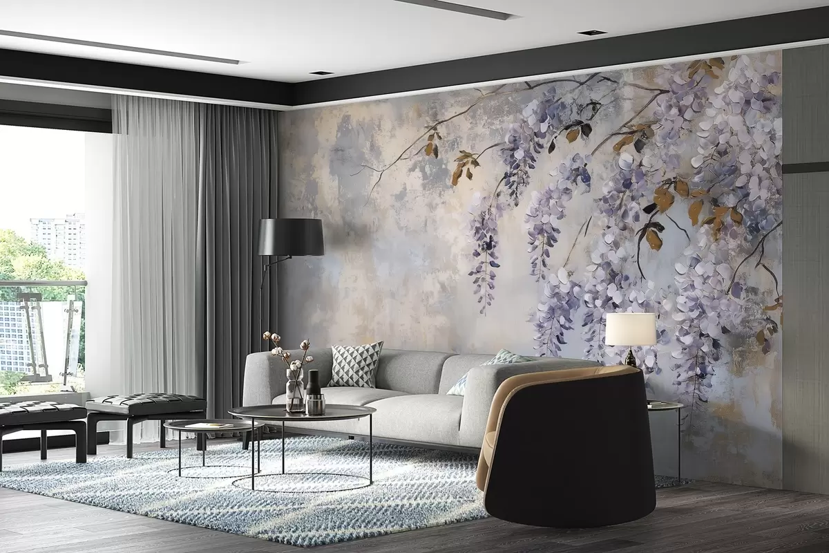 Carta da parati carta da parati dai colori tenui e sfumati con delicati fiori e rami di glicine. nr. w02451