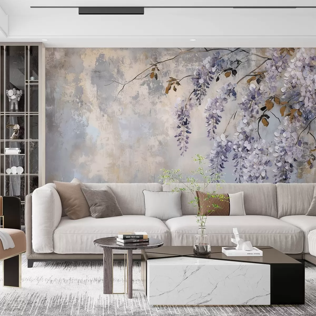 Carta da parati carta da parati dai colori tenui e sfumati con delicati fiori e rami di glicine. nr. w02451