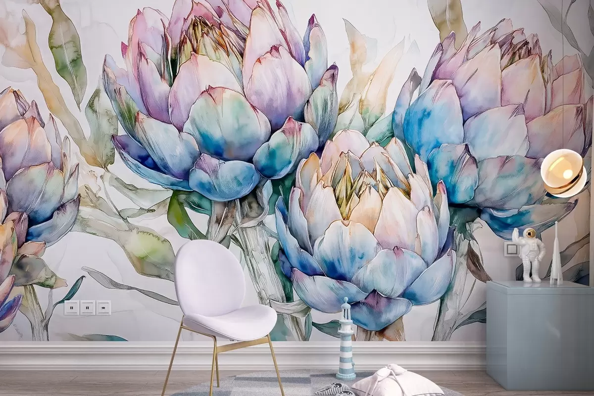 Carta da parati Disegno di carciofi, stile acquerello, floreale, viola, beige, verde nr. w02484