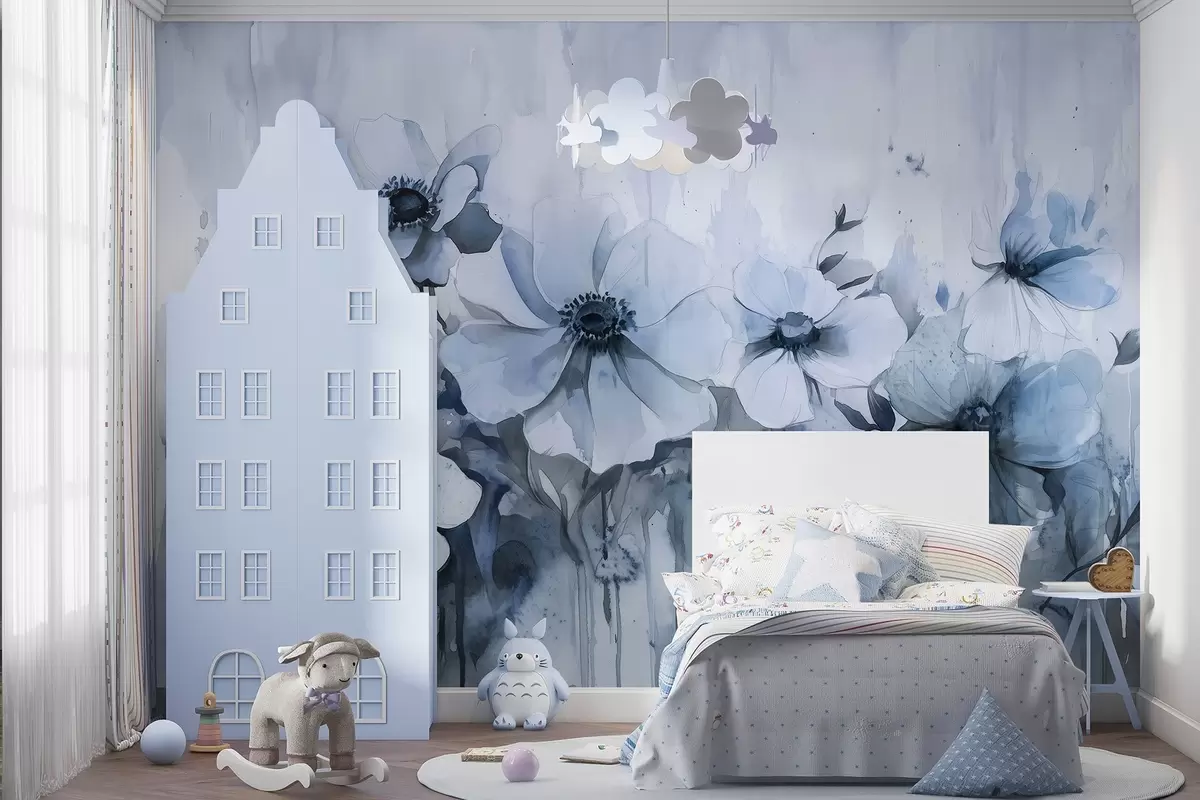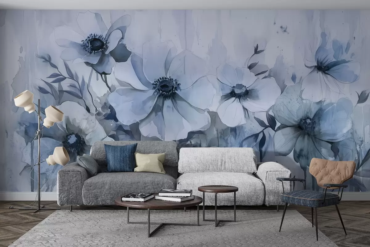 Carta da parati Fiori rustici, disegno in stile acquerello, colori blu nr. w02487v1