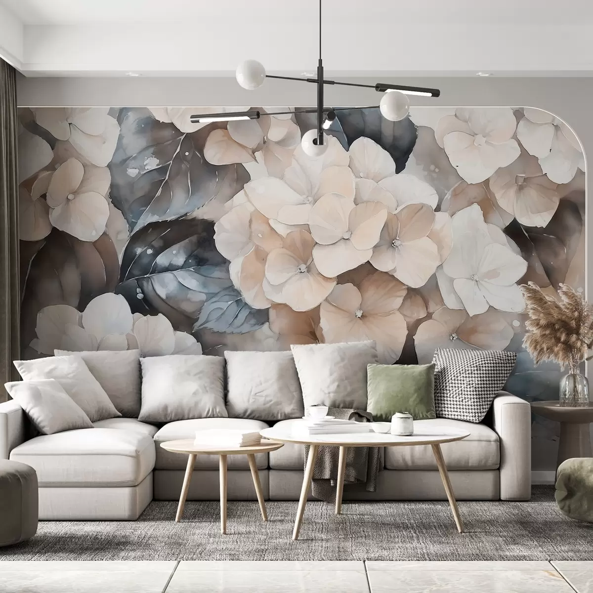 Carta da parati Fiori di ortensia, disegno in stile acquerello, colori beige, floreale nr. w02488