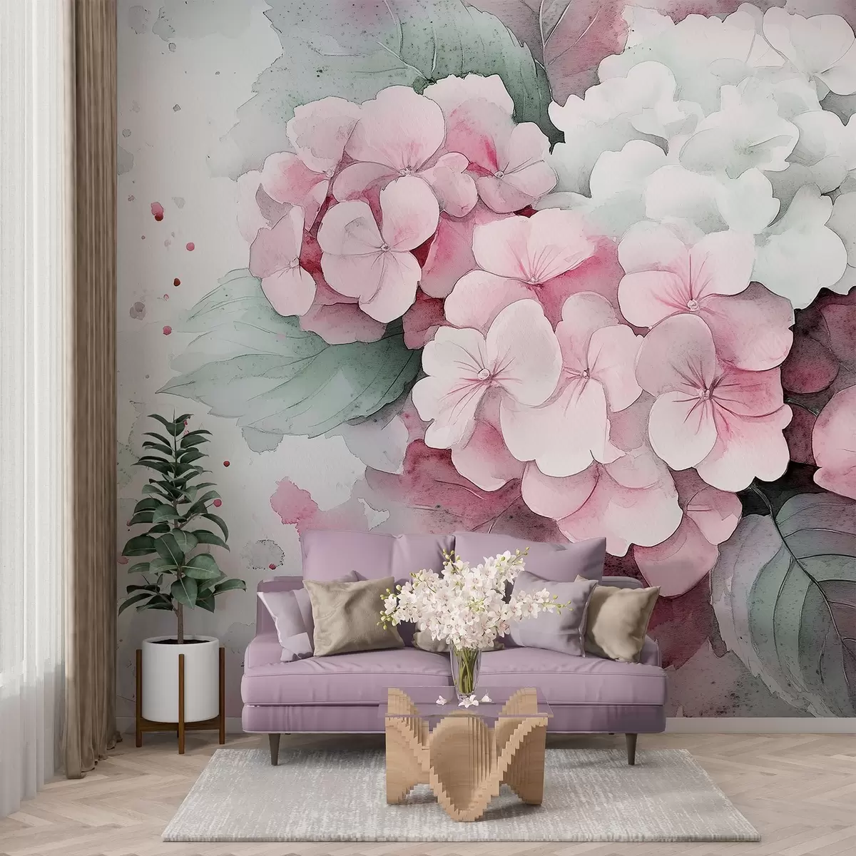 Carta da parati Disegno in stile acquerello di fiori di ortensia con foglie, colori rosa tenue e verde nr. w02493v1
