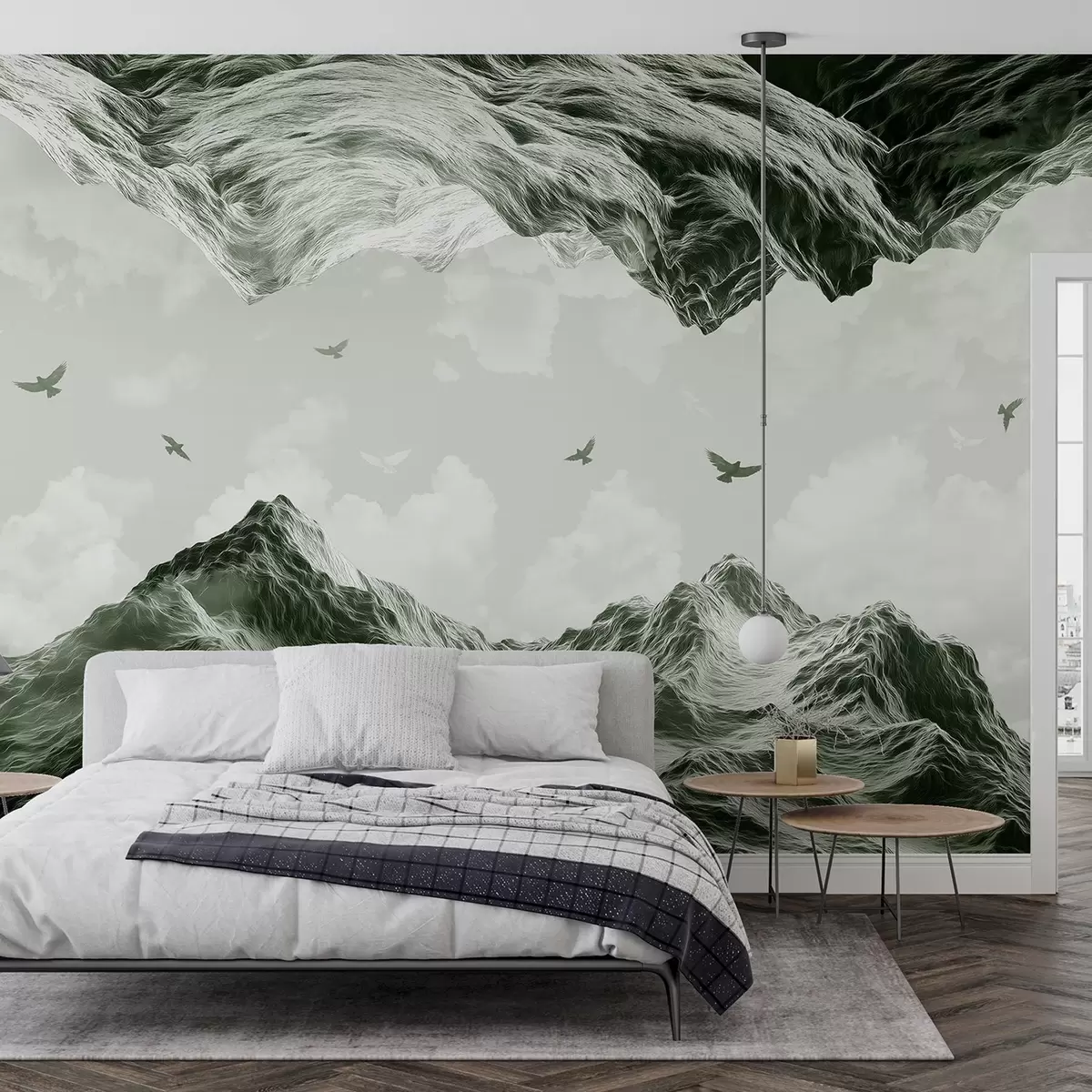 Carta da parati Paesaggio montano, realismo, uccelli in volo, natura, nuvole, colori verdi nr. w02514v3