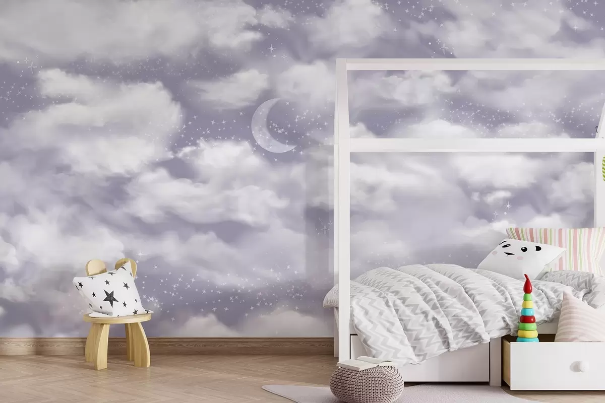 Carta da parati Cielo stellato con luna e nuvole, sognante, etereo, colori viola tenui nr. w02515v4