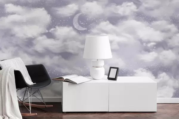 Carta da parati Cielo stellato con luna e nuvole, sognante, etereo, colori viola tenui nr. w02515v4