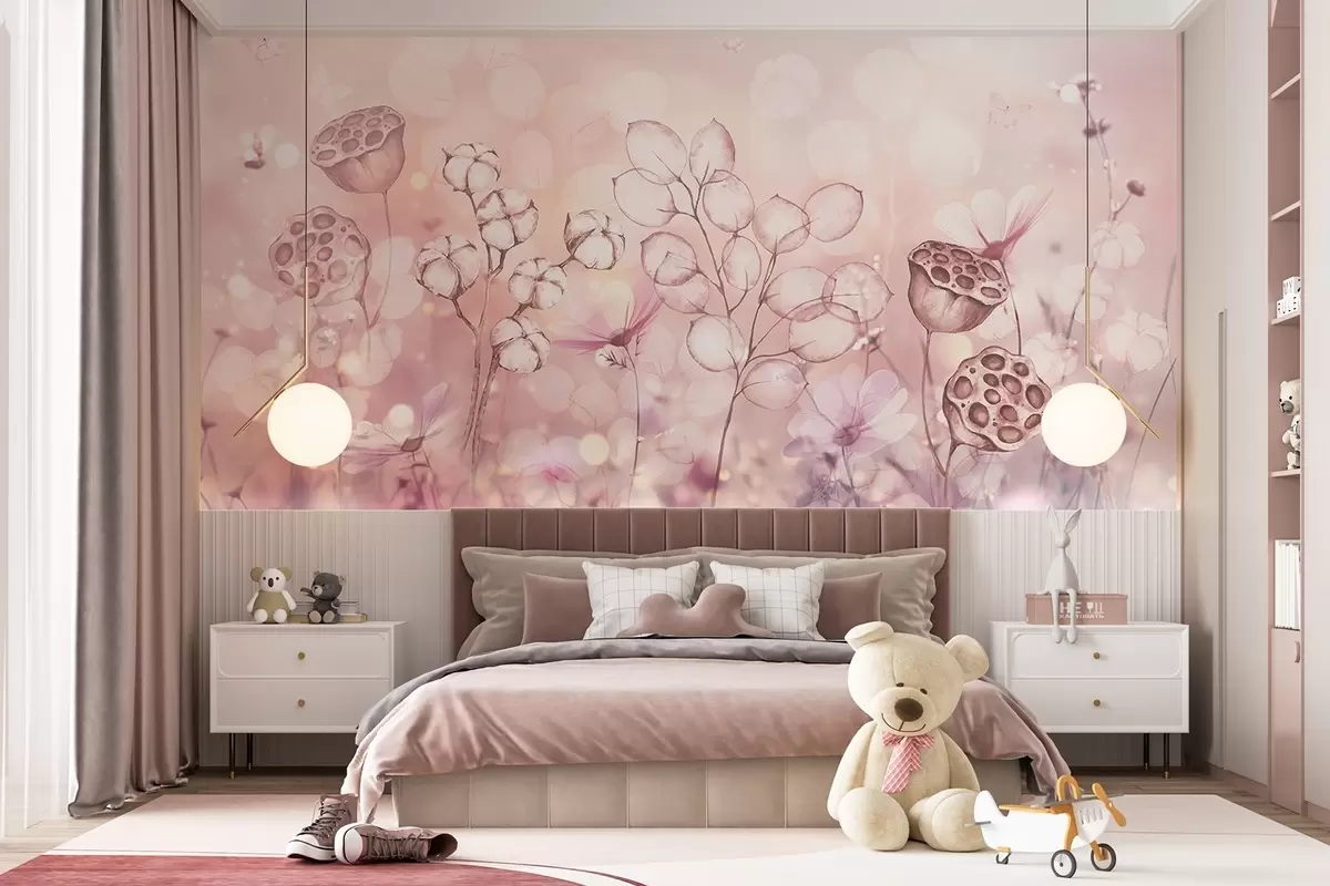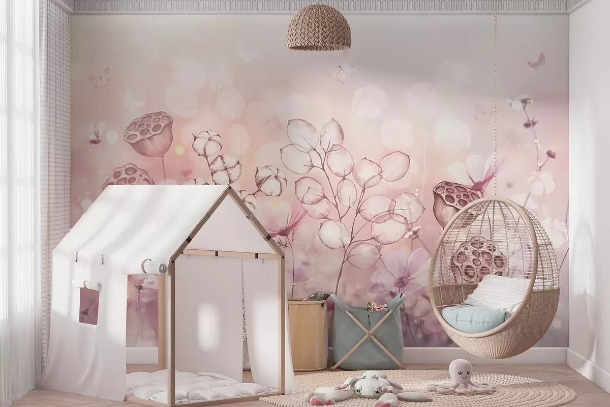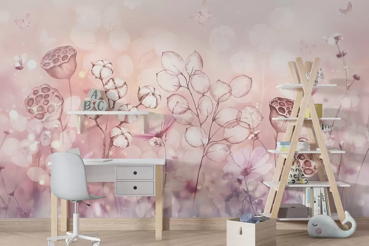 Carta da parati Giardino fiorito sognante, farfalla, fiori di cotone, loto, colori rosa nr. w02516