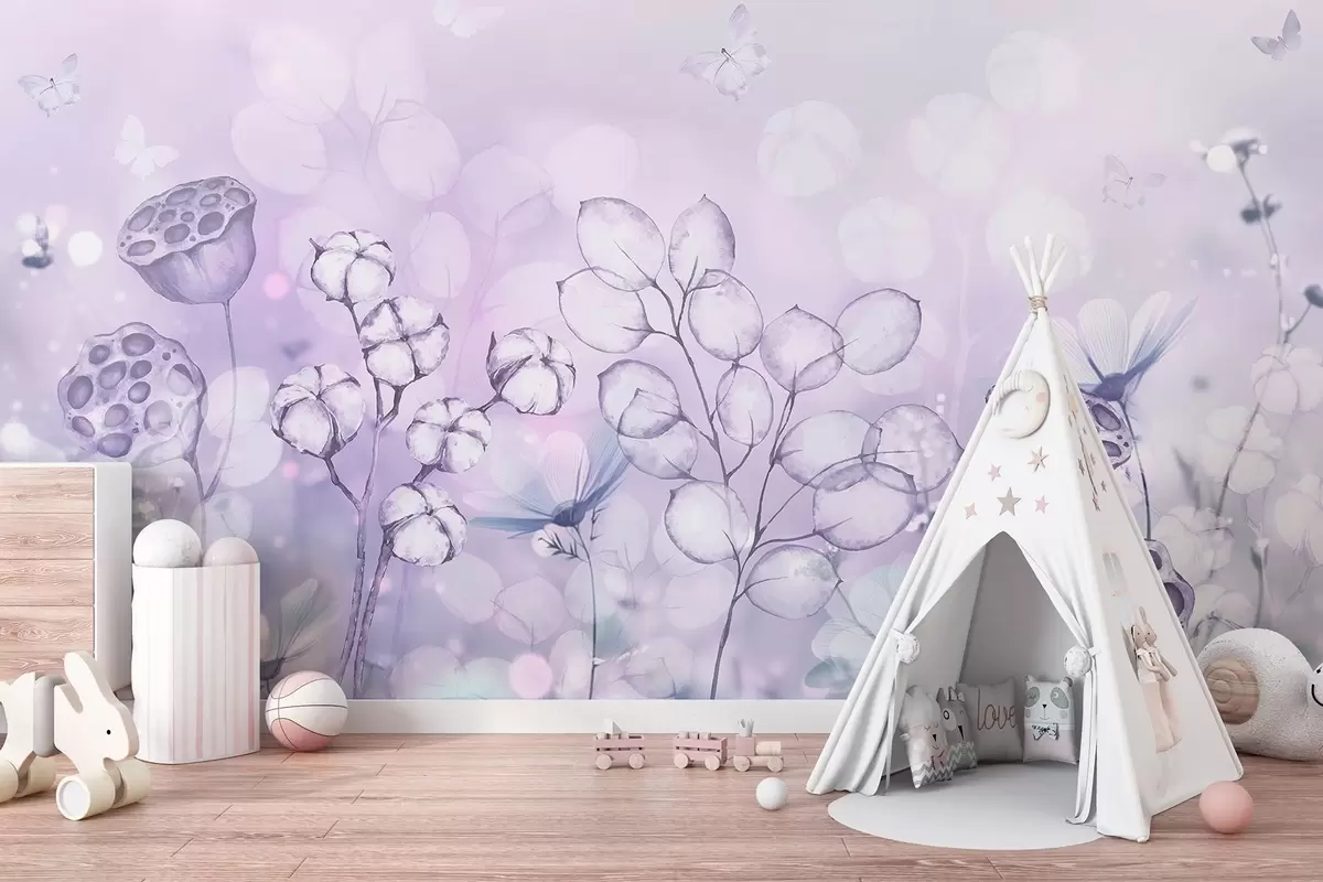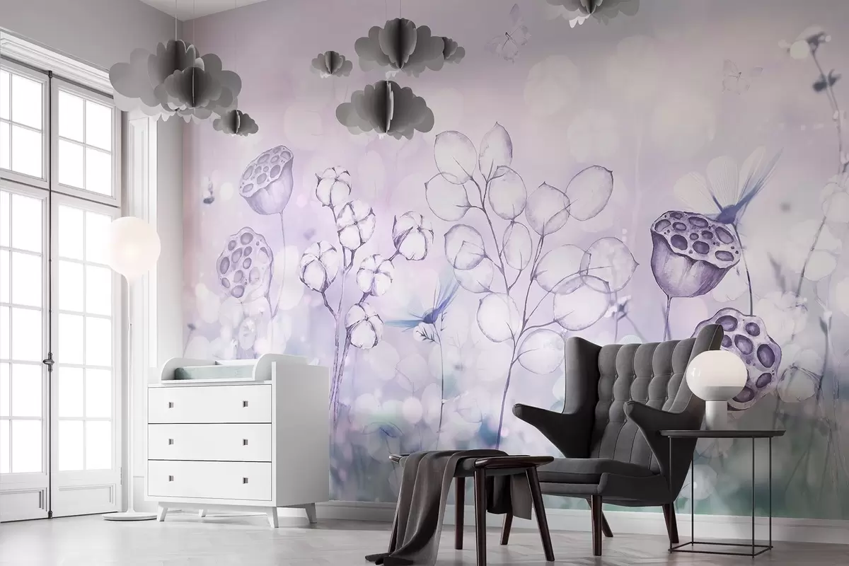 Carta da parati Giardino fiorito sognante, farfalla, fiori di cotone, loti, colori viola nr. w02516v1