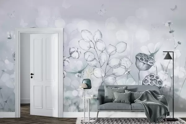 Carta da parati Giardino fiorito da sogno, farfalle, fiori di cotone, loti, colori grigi nr. w02516v2