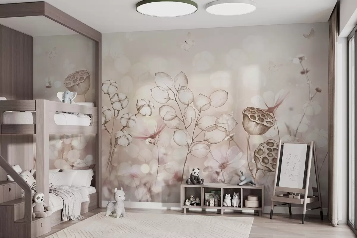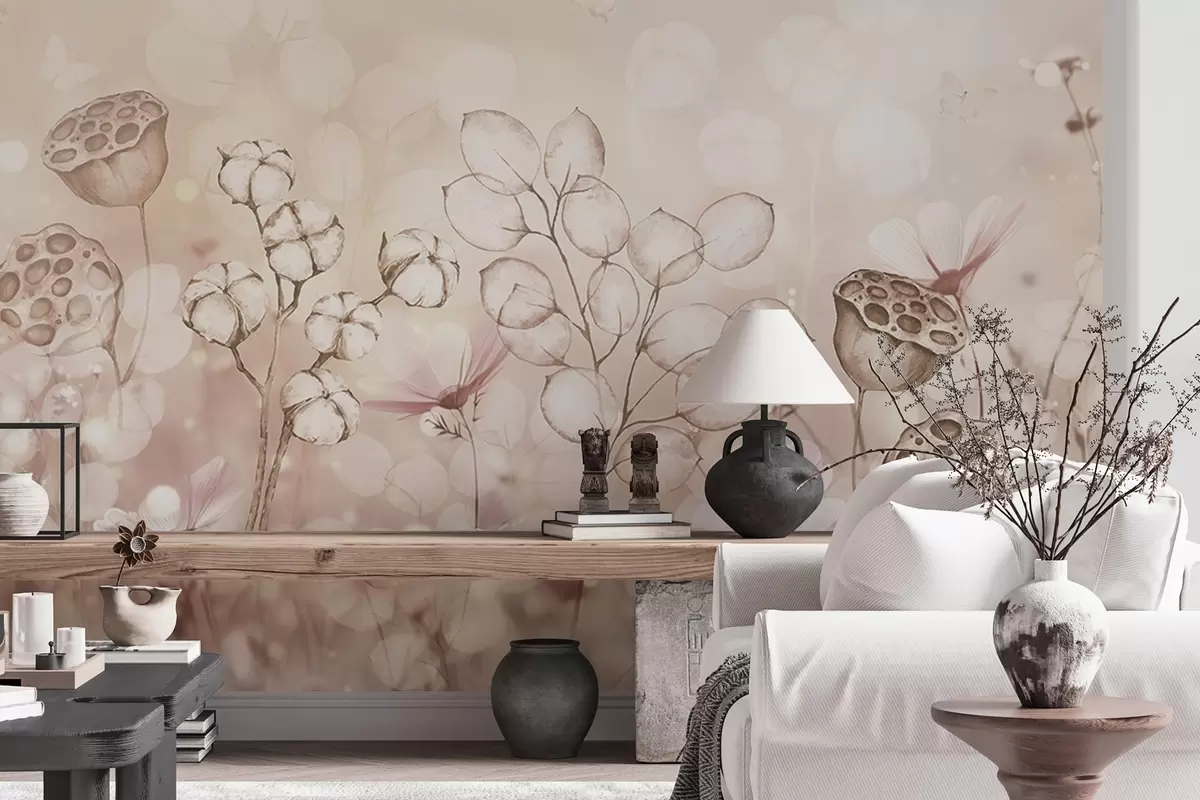 Carta da parati Giardino fiorito sognante, farfalla, fiori di cotone, loti, colori beige nr. w02516v3