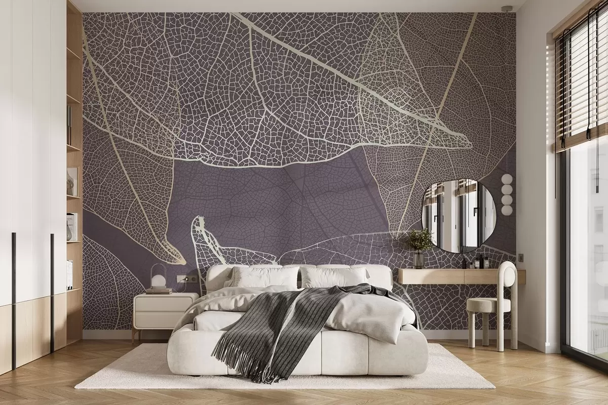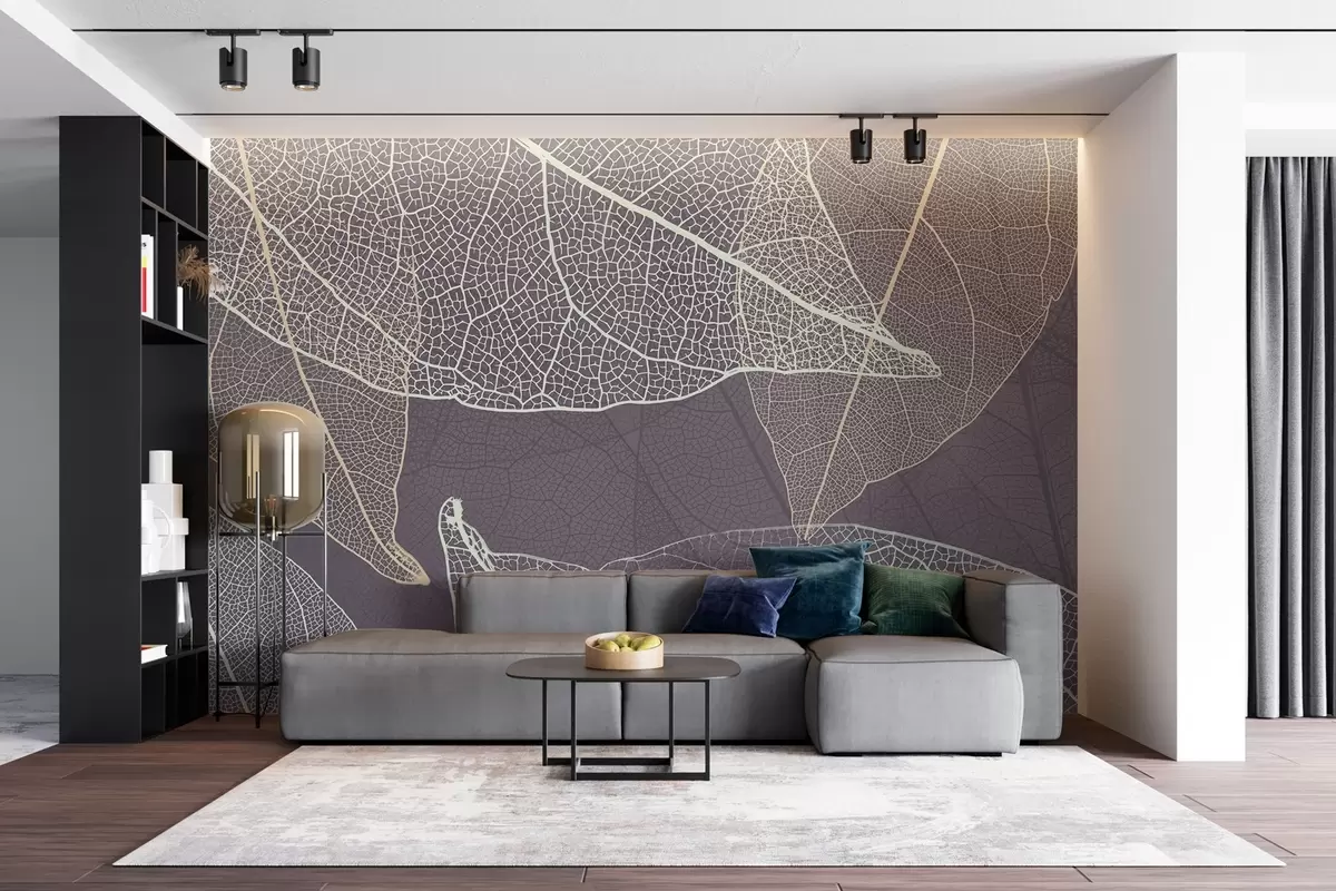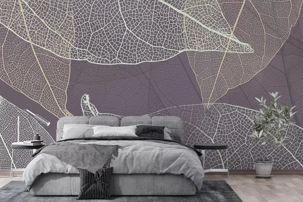 Carta da parati primo piano di foglie con venature nei toni del grigio-viola nr. w02520v3