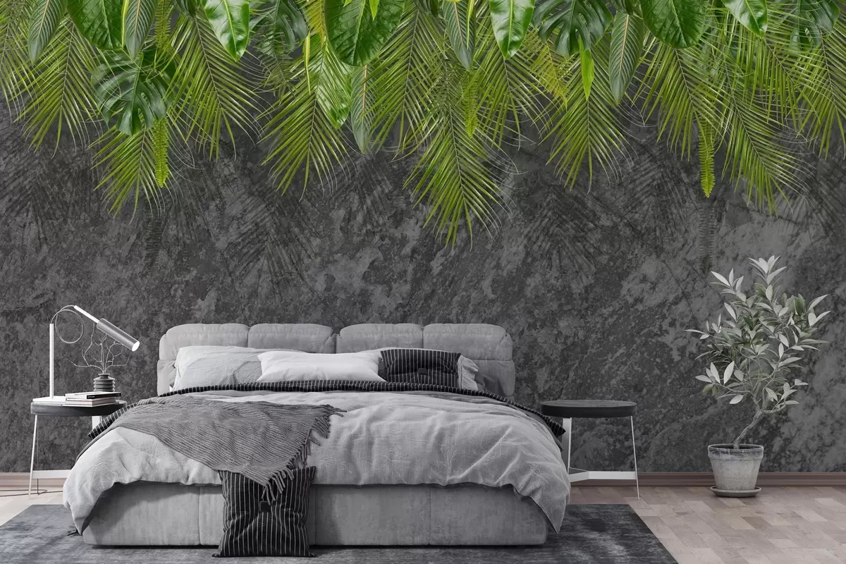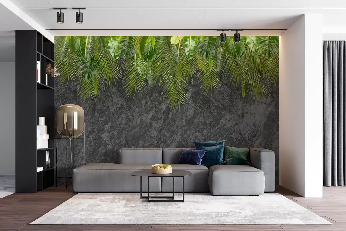 Carta da parati foglie tropicali su sfondo di finta pietra nr. w02547