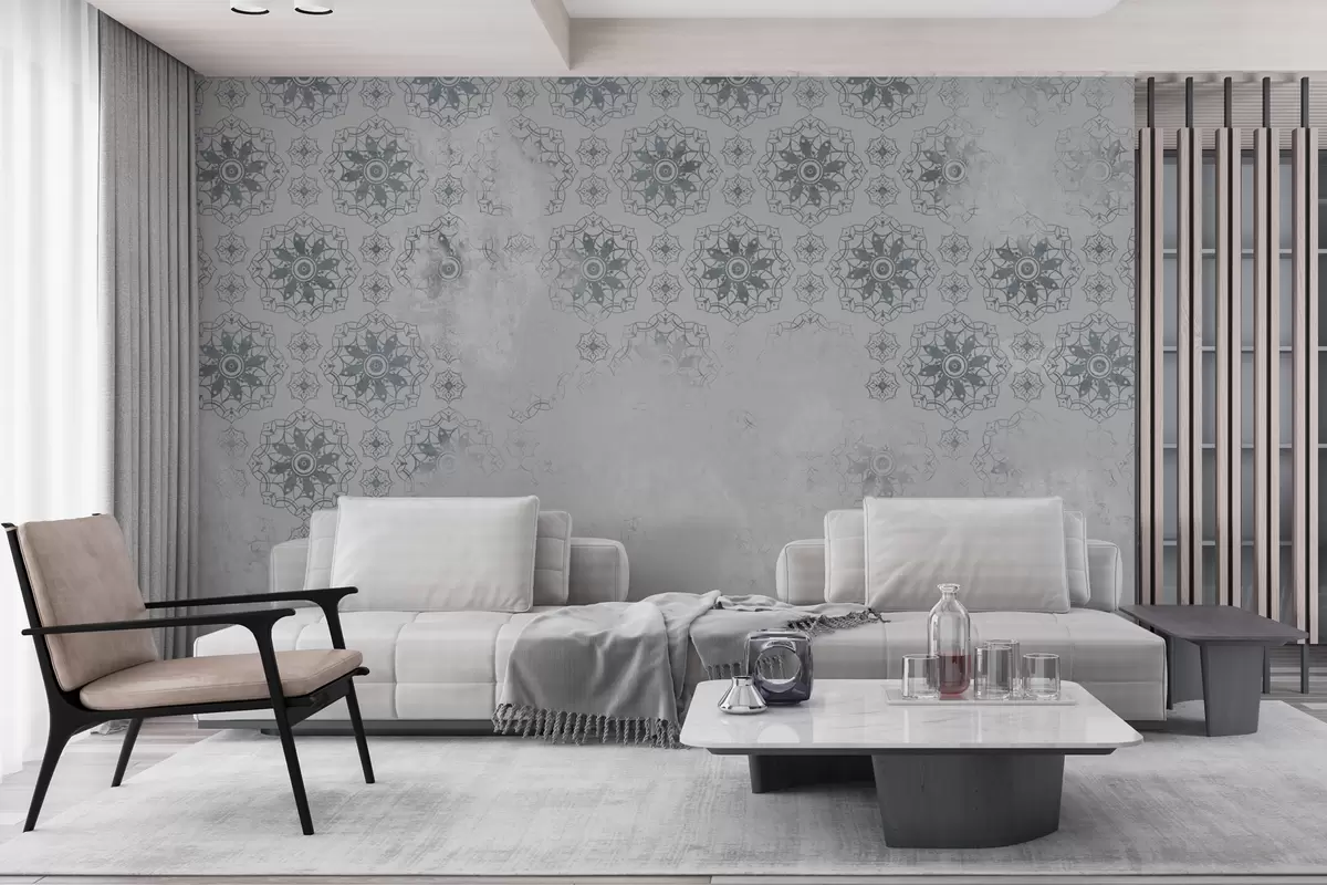 Carta da parati Design vintage con elementi mandala ed effetto anticato in grigio chiaro nr. w02551v2