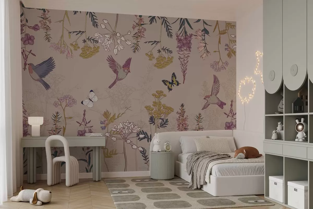 Carta da parati un insieme di fiori selvatici e uccelli su uno sfondo beige nr. w02634