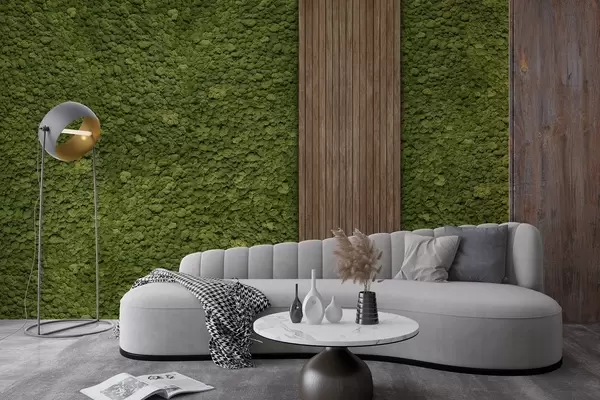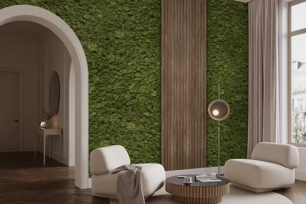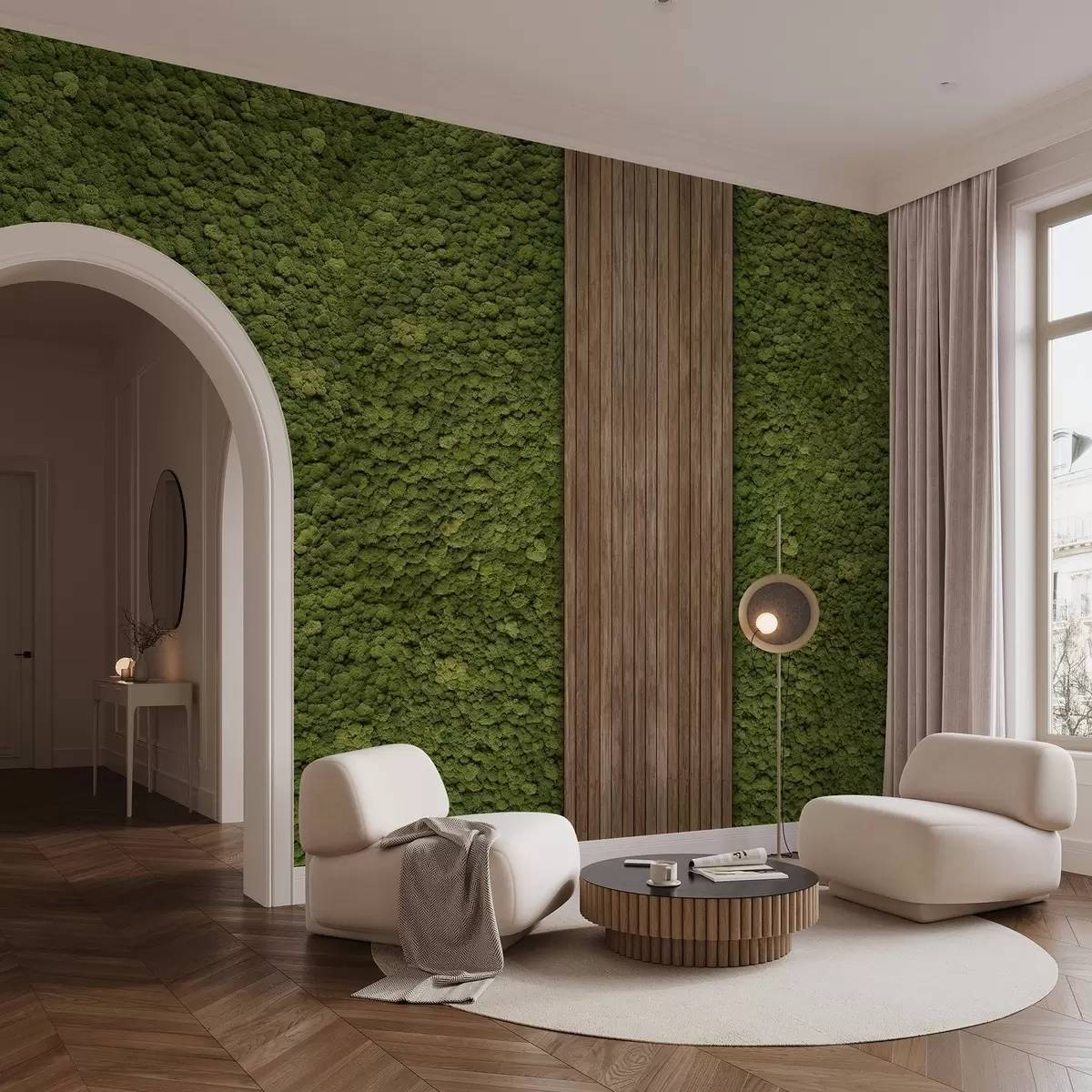 Carta da parati Parete in stile muschio con pannello in legno, colori olivastri nr. w02656v3