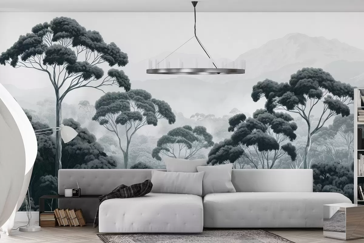 Carta da parati Foresta della giungla, montagne, tropicale, natura, grandi alberi, colori blu scuro nr. w02739