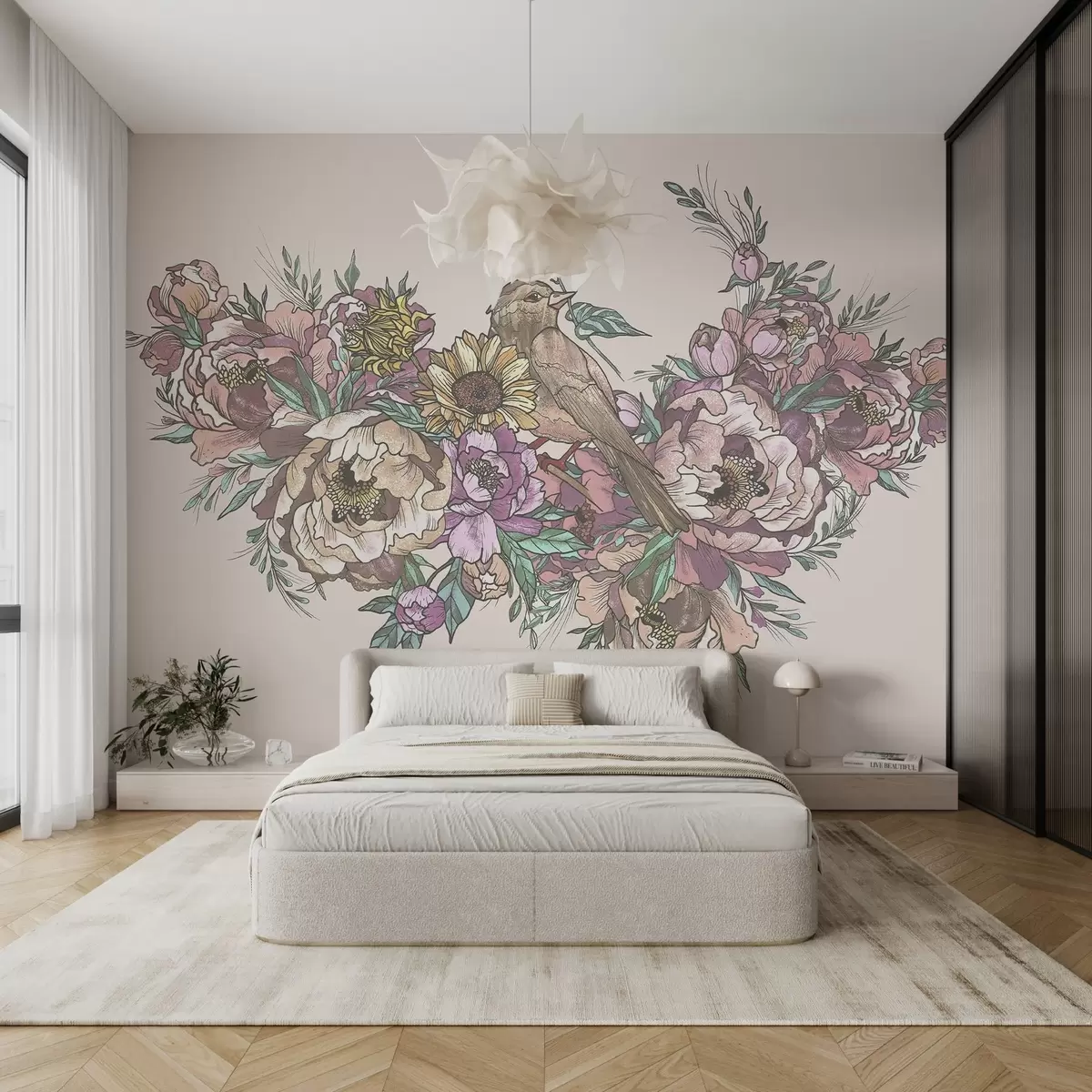Carta da parati Illustrazione floreale e di uccelli d'epoca nr. w02833