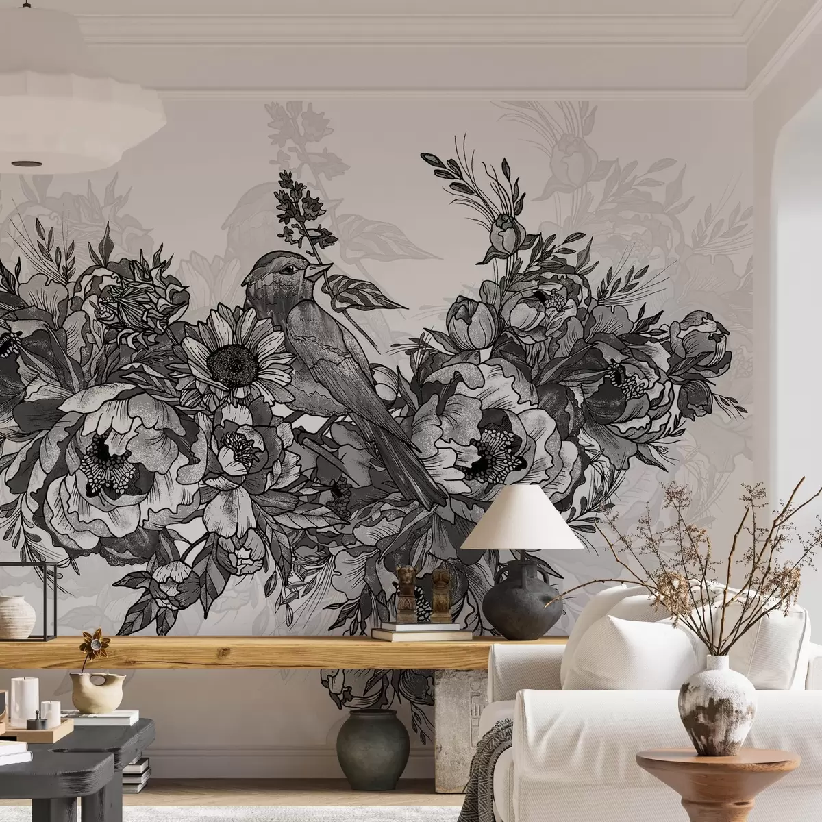 Carta da parati Composizione monocromatica di fiori e uccelli nr. w02834