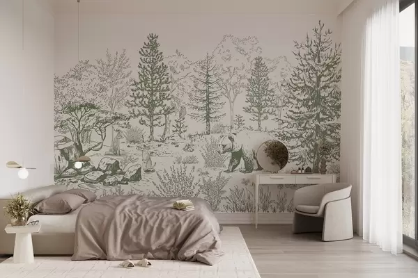 Carta da parati Vita nella foresta, alberi, animali selvatici, orso, volpe, gufo, cespugli, disegno a matita, colori verdi nr. w02929v2