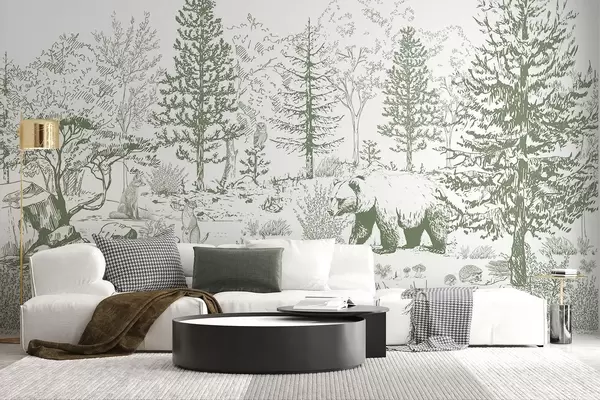 Carta da parati Vita nella foresta, alberi, animali selvatici, orso, volpe, gufo, cespugli, disegno a matita, colori verdi nr. w02929v2