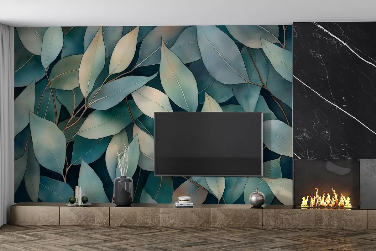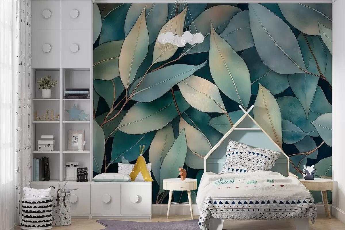 Carta da parati Foglie di eucalipto, disegno in stile acquerello, motivo floreale, colori verdi nr. w02931
