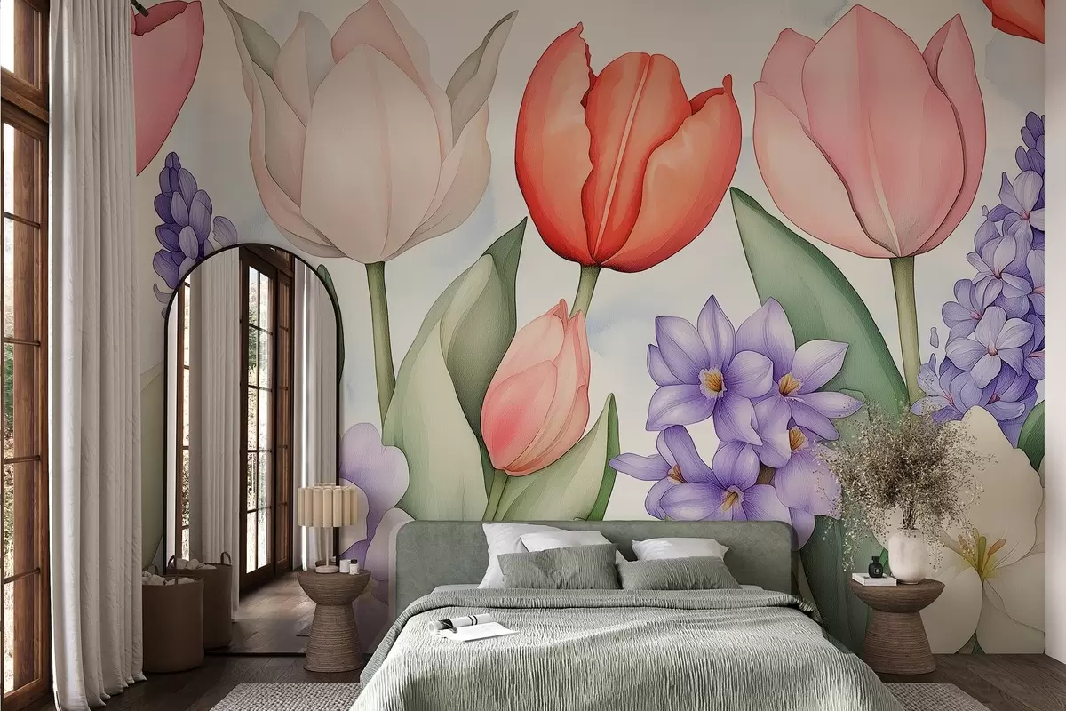 Carta da parati Fiori di primavera, tulipani, giacinti, disegno in stile acquerello, floreale nr. w02940