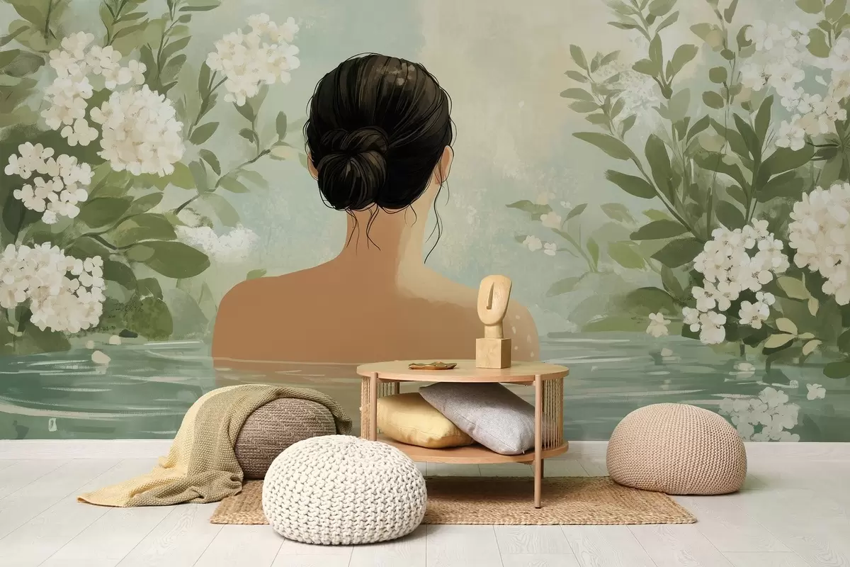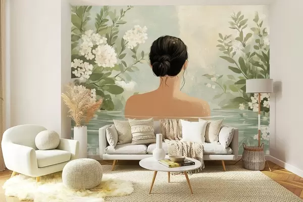 Carta da parati un'illustrazione botanica serena e sognante di una donna che fa il bagno in uno specchio d'acqua calmo e riflessivo, circondata da una vegetazione lussureggiante e da delicati fiori bianchi. nr. w03014