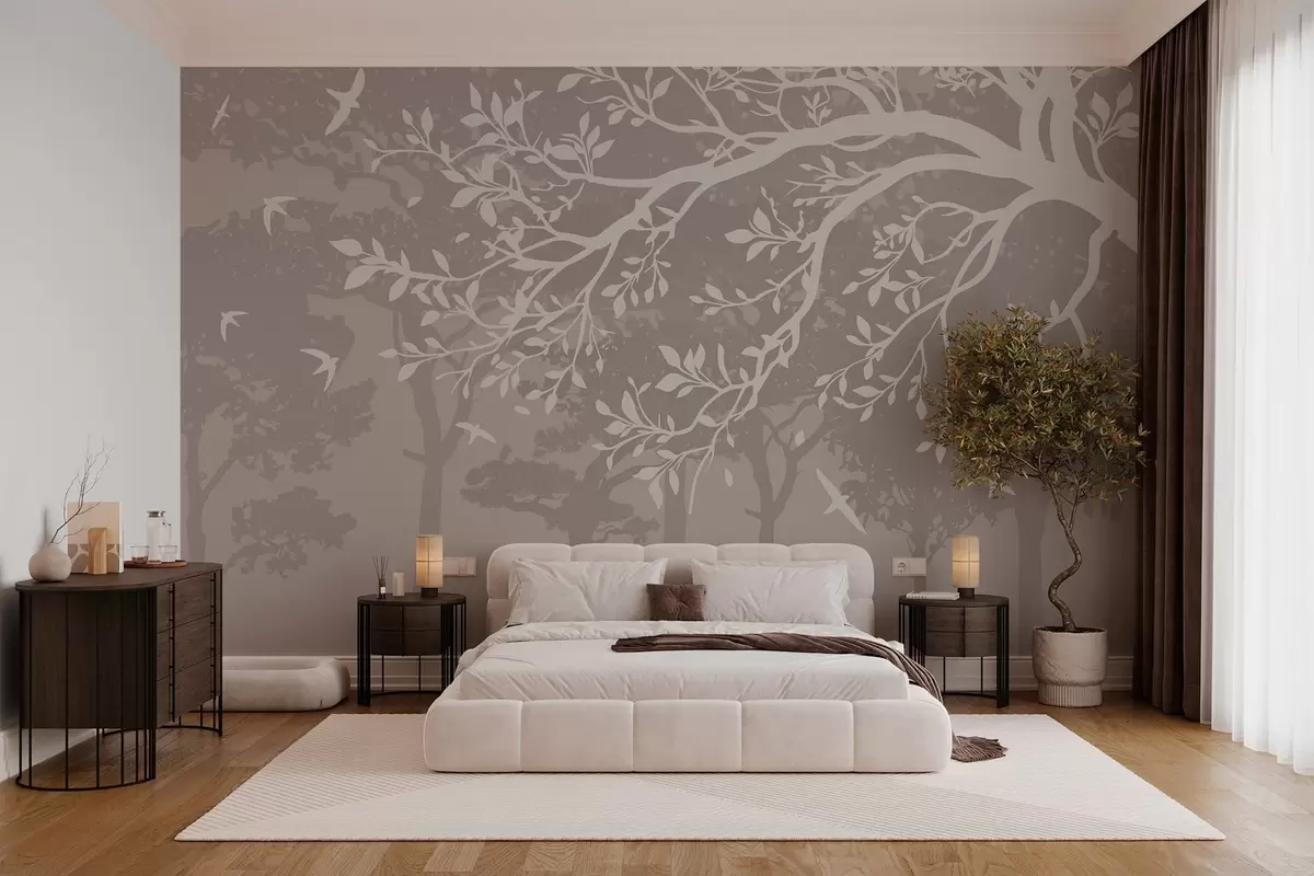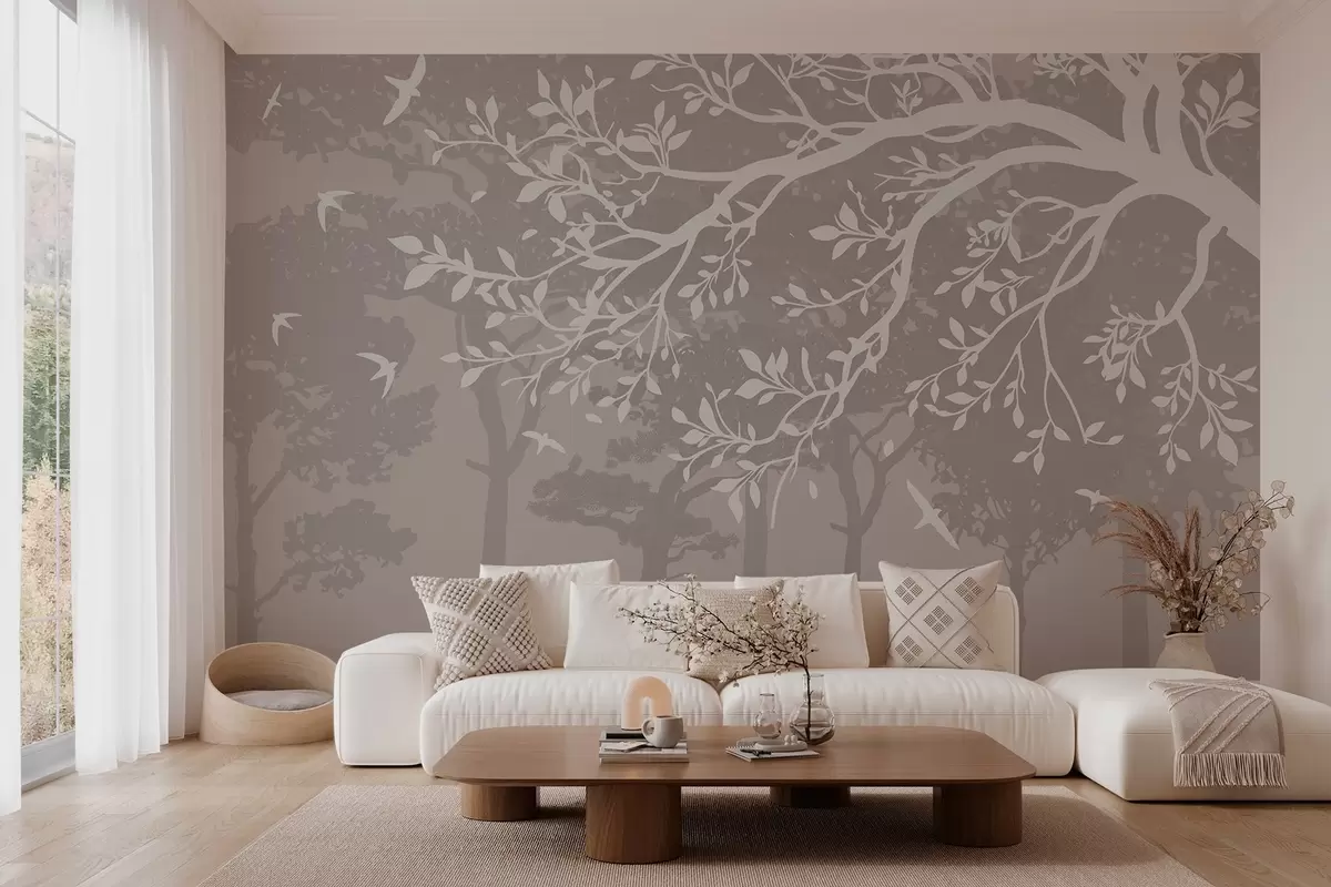 Carta da parati silhouette di un ramo d'albero cremoso con gli uccelli, sullo sfondo della foresta nr. w03116