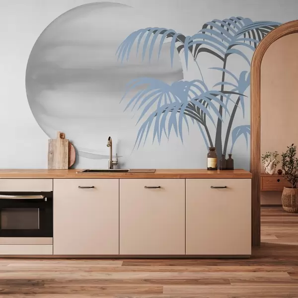 Carta da parati Albero di palma su uno sfondo a macchie, tonalità di grigio e blu nr. w03185