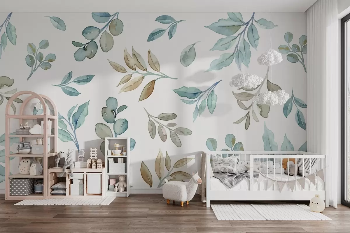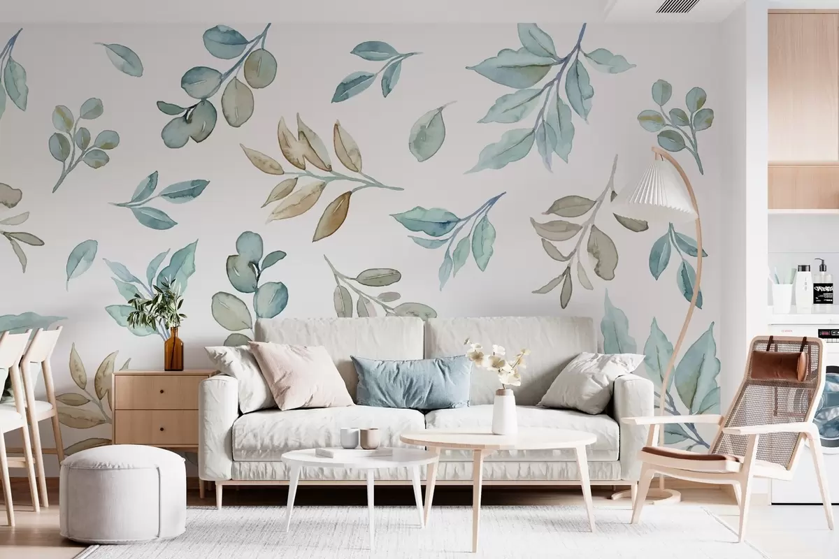 Carta da parati varie foglie e rami in tecnica acquerello nei toni del blu e del beige su sfondo bianco nr. w03280