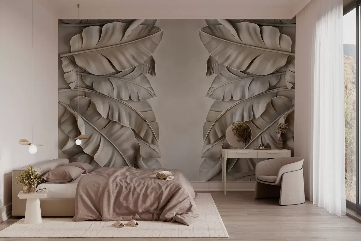 Carta da parati imitazione di un bassorilievo con foglie tropicali in tonalità beige nr. w03285