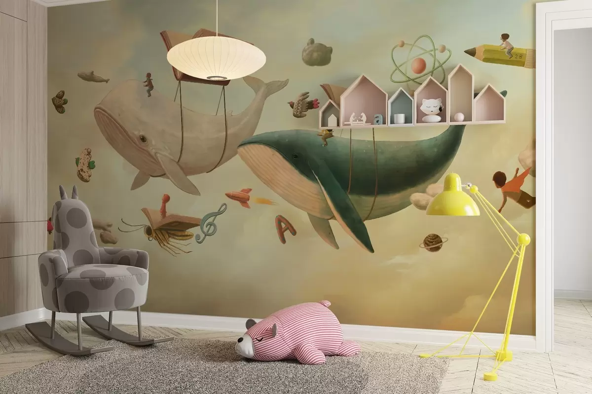 Carta da parati Un'illustrazione stravagante di balene che volano nel cielo sotto palloncini a forma di libro nr. w03327v1