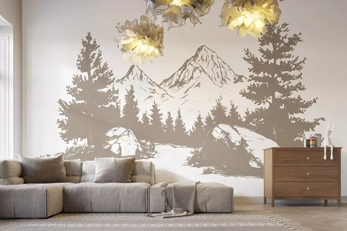 Carta da parati Le Alpi, montagne con foresta, disegno al tratto, colore beige nr. w03342