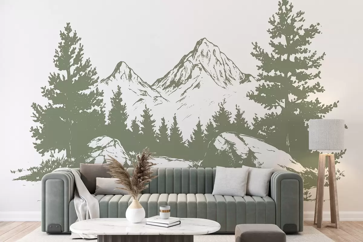 Carta da parati Le Alpi, montagne con foresta, disegno al tratto, colore verde nr. w03342v1