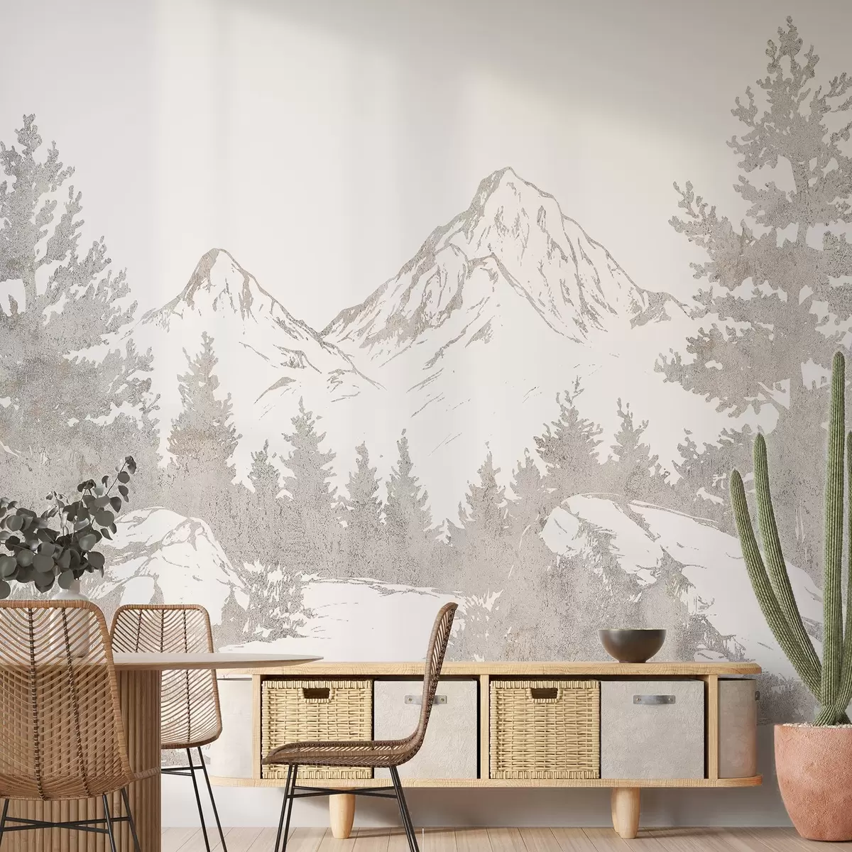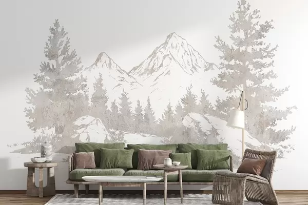 Carta da parati Alpi, montagne con foresta, disegno al tratto, colori naturali nr. w03343