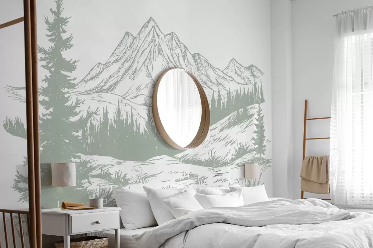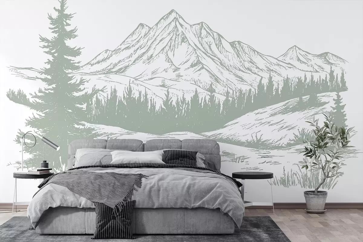 Carta da parati Montagne paesaggio con alberi di pino, foresta, natura, colore verde morbido nr. w03344v1