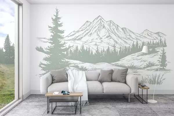 Carta da parati Montagne paesaggio con alberi di pino, foresta, natura, colore verde morbido nr. w03344v1