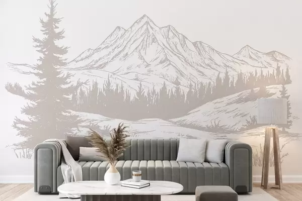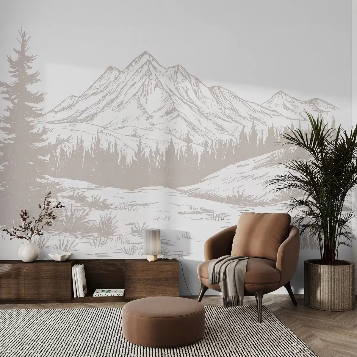 Carta da parati Paesaggio di montagna con alberi di pino, foresta, natura, colore beige morbido nr. w03344v3