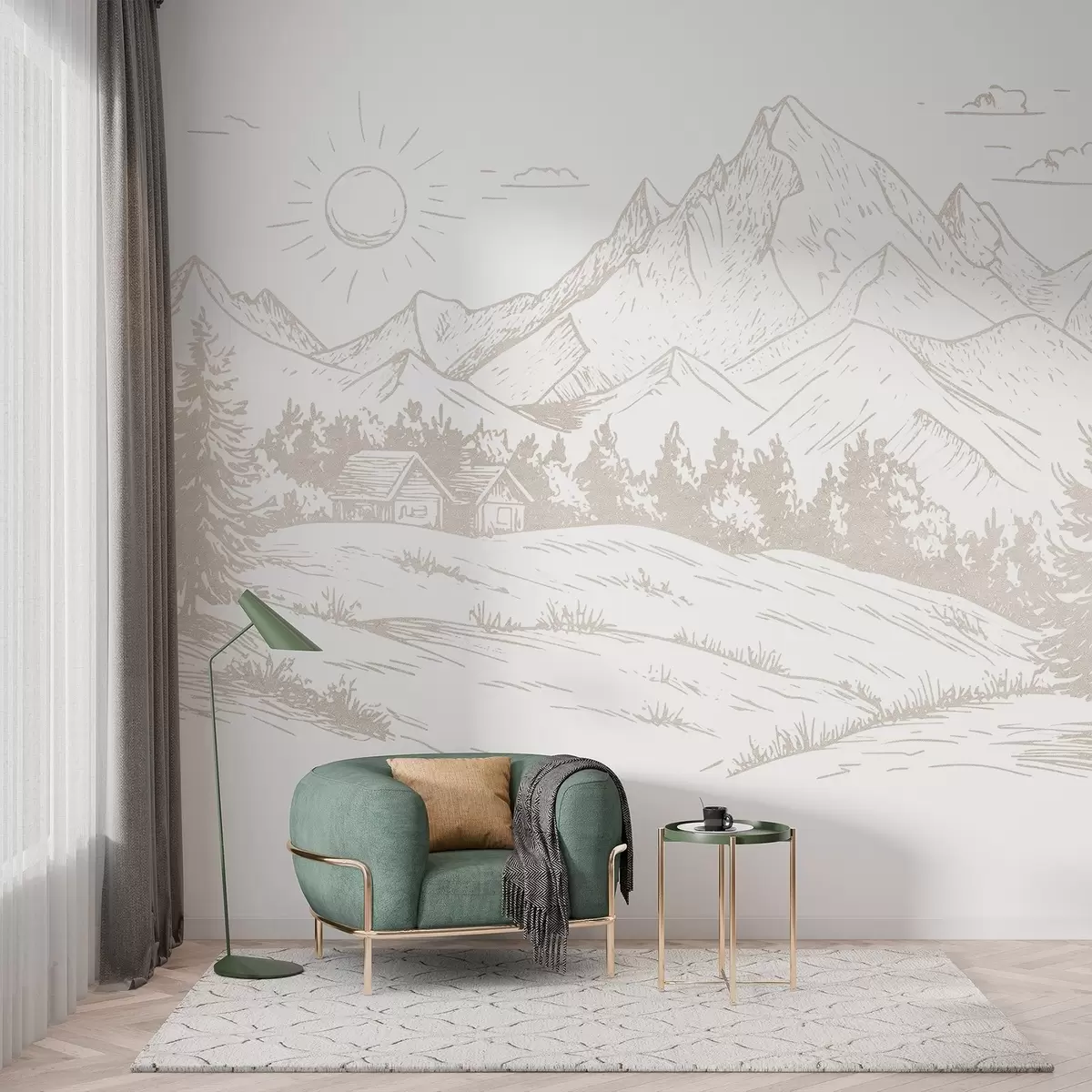 Carta da parati Disegno di montagne, paesaggi naturali, foresta, case di legno, colore beige nr. w03348