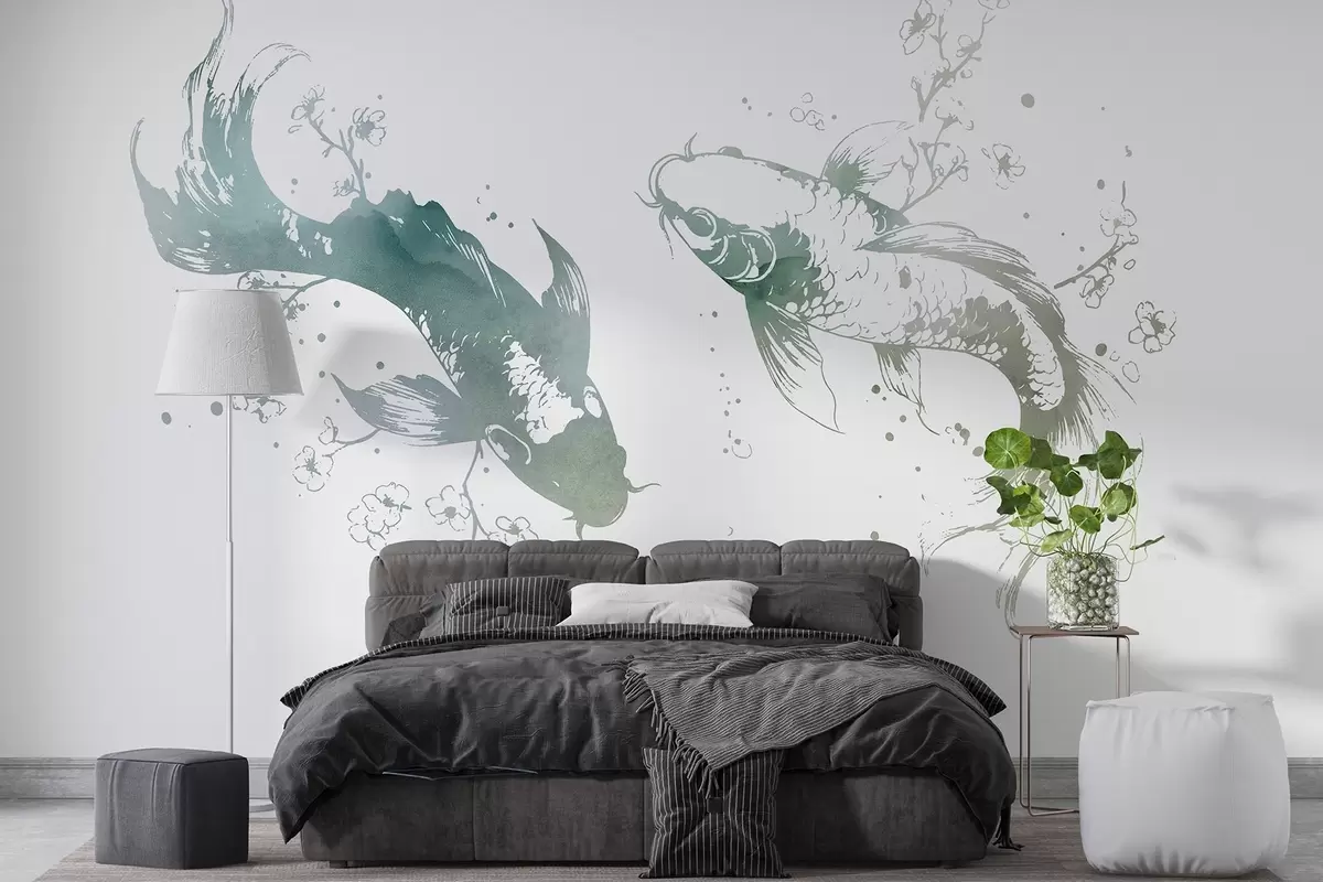 Carta da parati Pesce acquerellato, stile orientale, albero di ciliegio, colori verdi nr. w03447v2