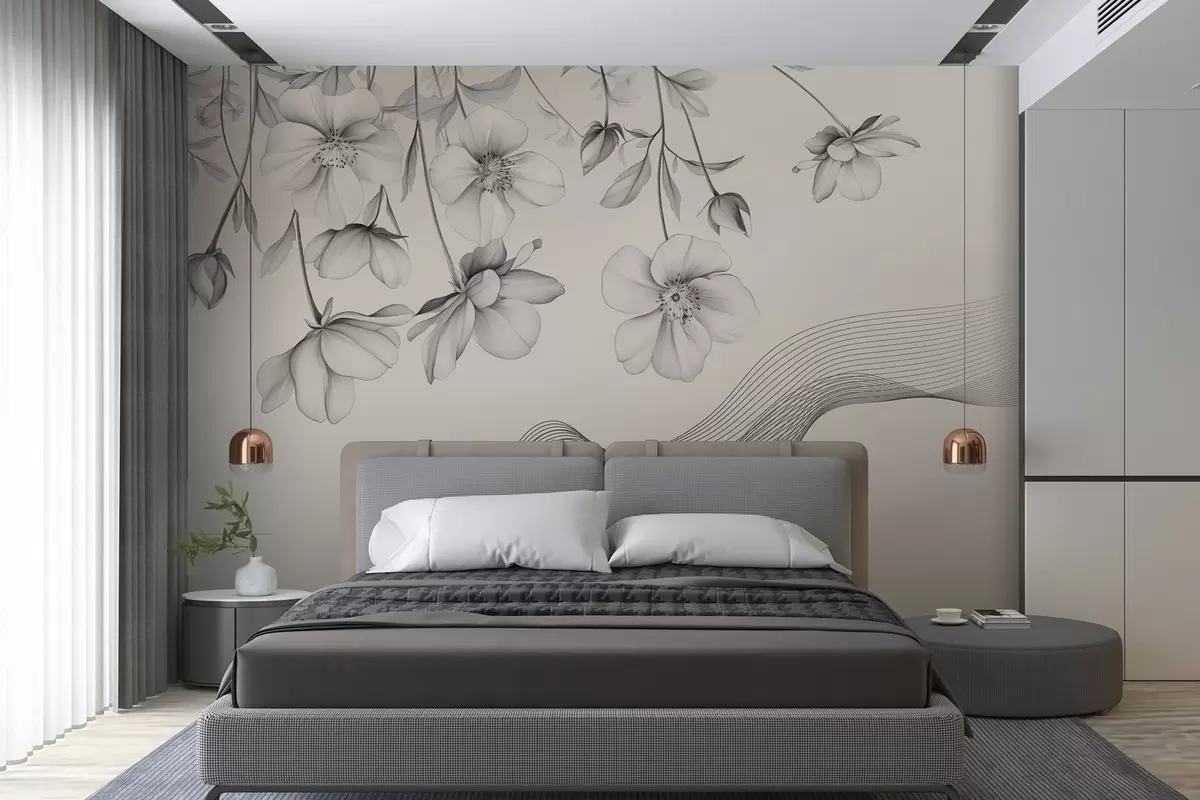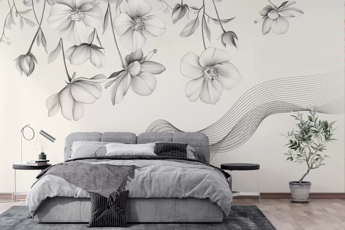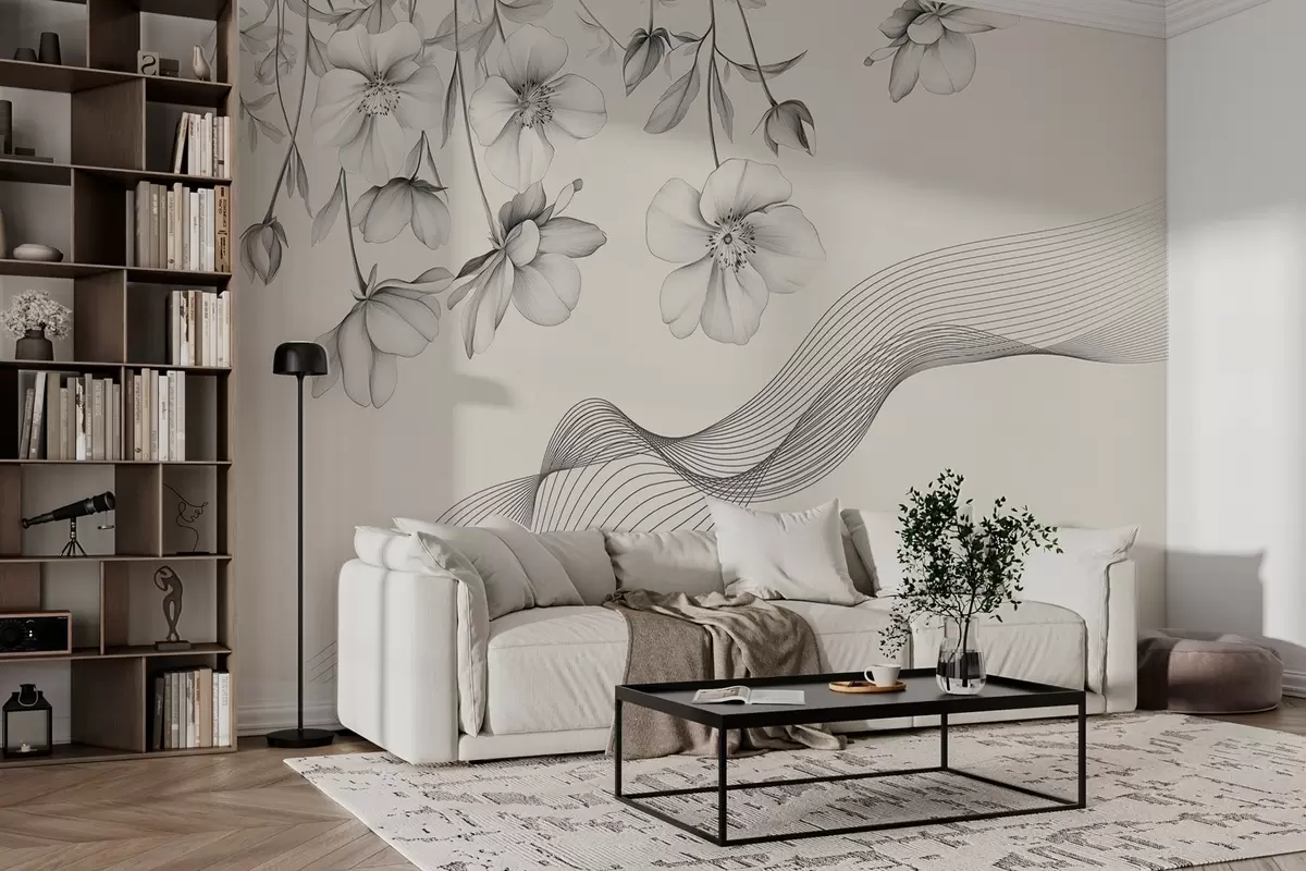 Carta da parati fiori e linee grafiche su sfondo chiaro nr. w03454