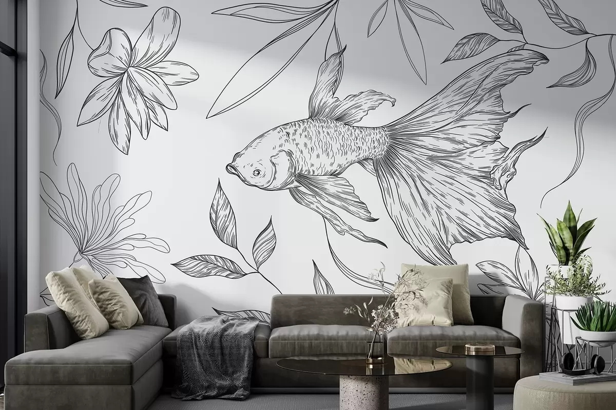 Carta da parati Disegno lineare di pesce con fiori, minimalismo, marino, floreale, stile inchiostro nr. w03516